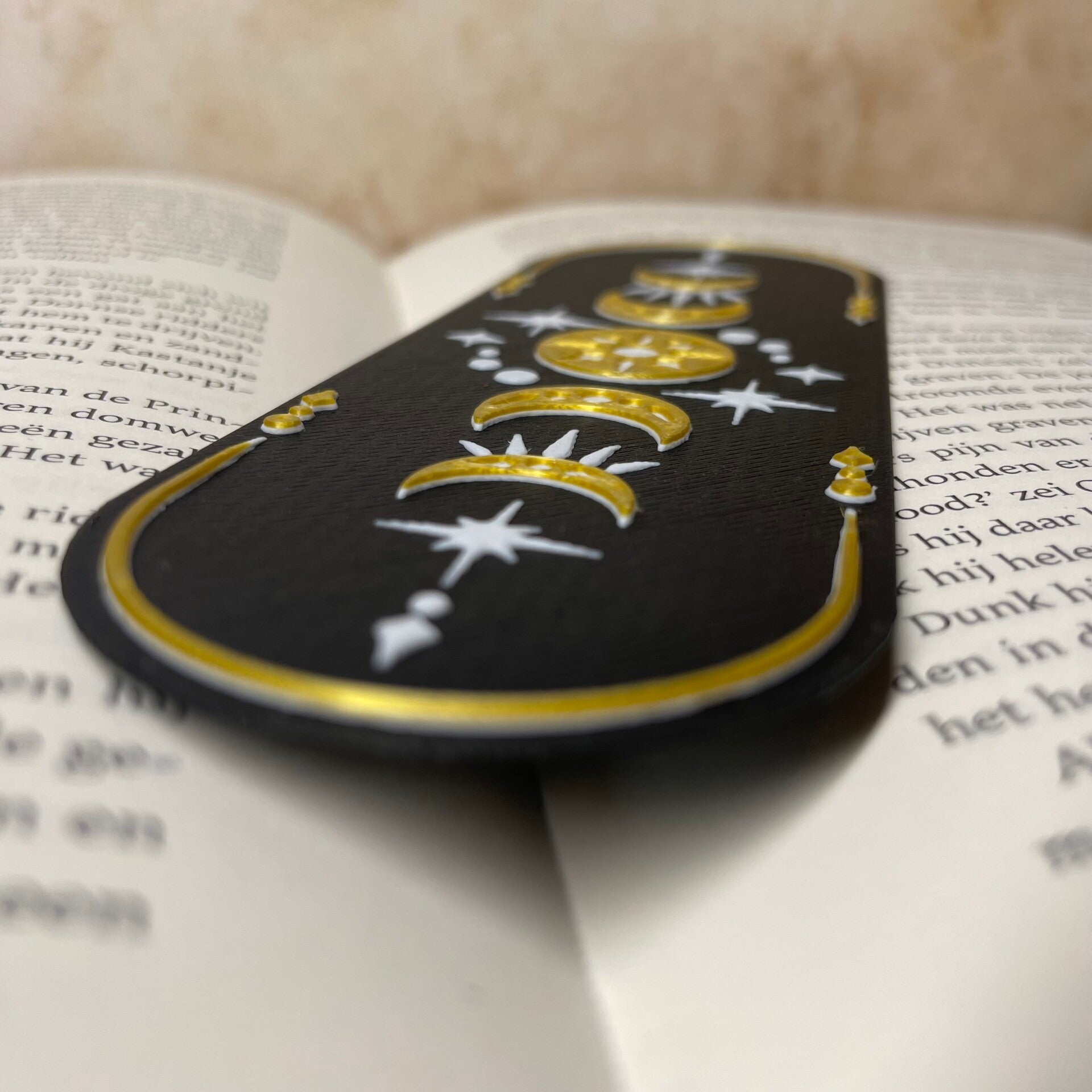 Dit ontwerp is gebaseerd op de populaire quote: 'To the stars who listen - and the dreams that are answered' uit A Court of Mist and Fury, deel 2 uit de ACOTAR-serie van Sarah J. Maas. De illustratie is mijn interpretatie van het sigil van de Night Court. De sprankelende filaments accentueren het ontwerp en geven de boekenlegger een schitterende uitstraling.